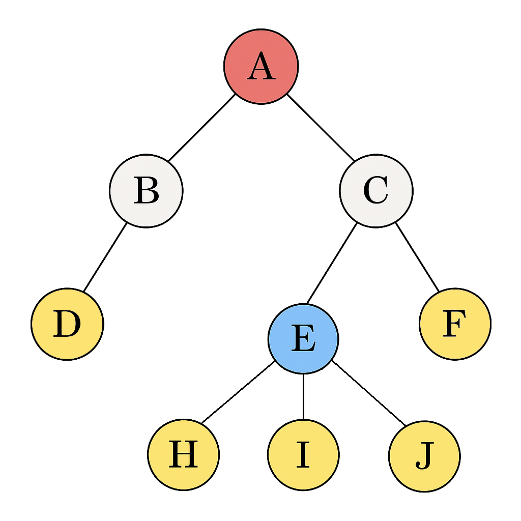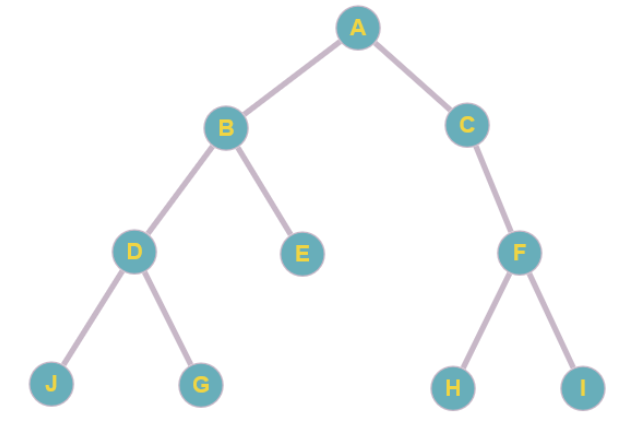 Le noeud A est la racine de l'arbre, les nœuds D, F, H, I et J sont des feuilles.