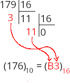Là encore, le principe est le même que pour la base 2, il suffit de faire des divisions successives, mais par 16. Et si le reste est supérieur à 10, on le remplace par la lettre correspondante :