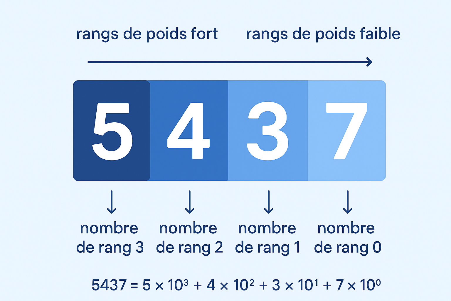Pour représenter ce nombre, on juxtapose les chiffres ayant chacun un rang (centaine, dizaine, unité, etc.) égal à une puissance entière de la base de numération (10², 10¹, 10⁰, etc.). Les chiffres s’écrivent de gauche à droite, par valeur décroissante de leur poids :